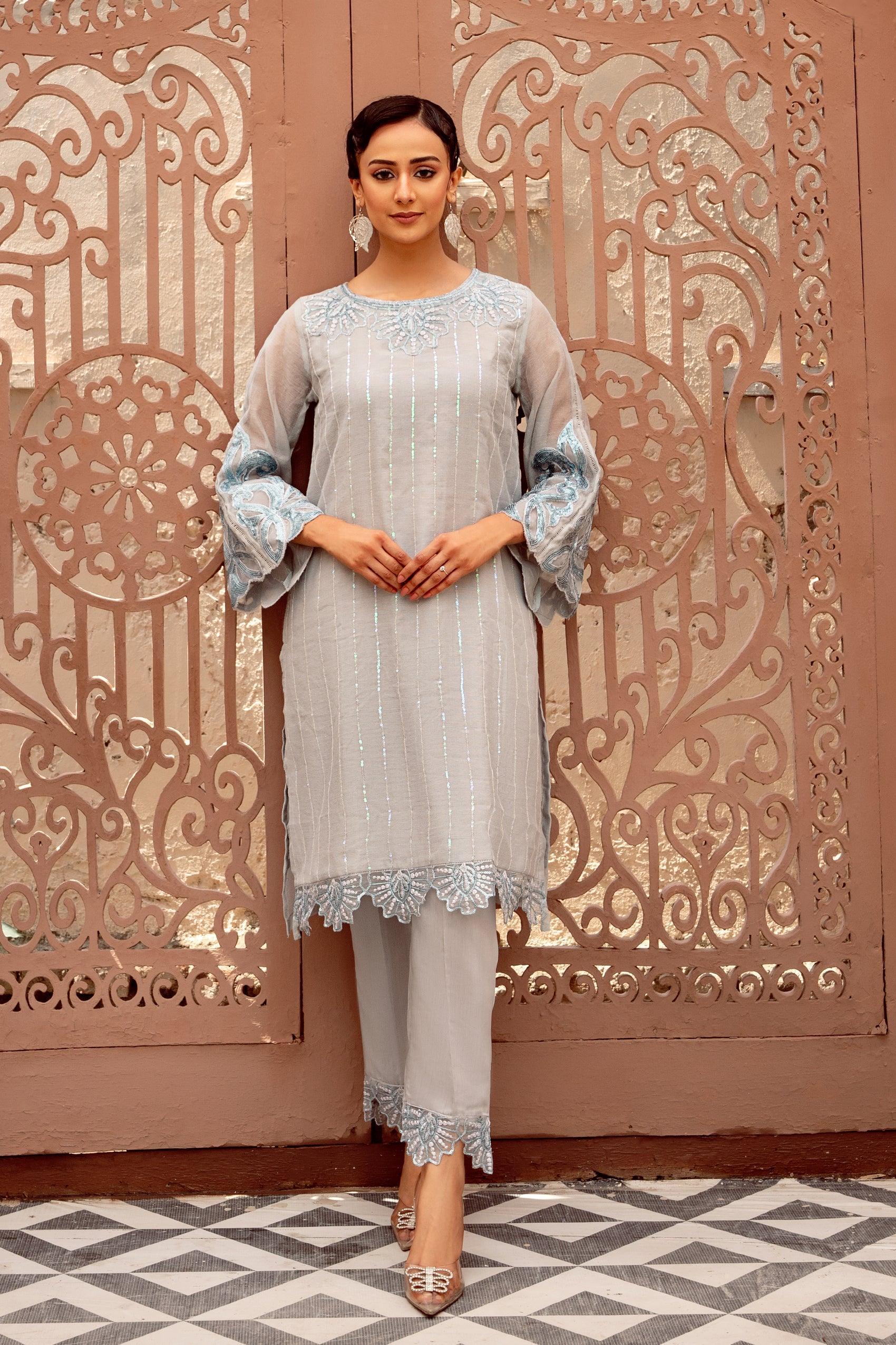 This exquisite ensemble in a subtle sky blue shade exudes graceful elegance. The contemporary shirt is adorned with intricate floral embroidery along the hem border, neckline, and sleeves, adding a refined charm to the look. Paired with a straight trouser, enhanced with an embroidered border at the bottom opening, this resplendent outfit makes a chic style statement for festive and special occasions.