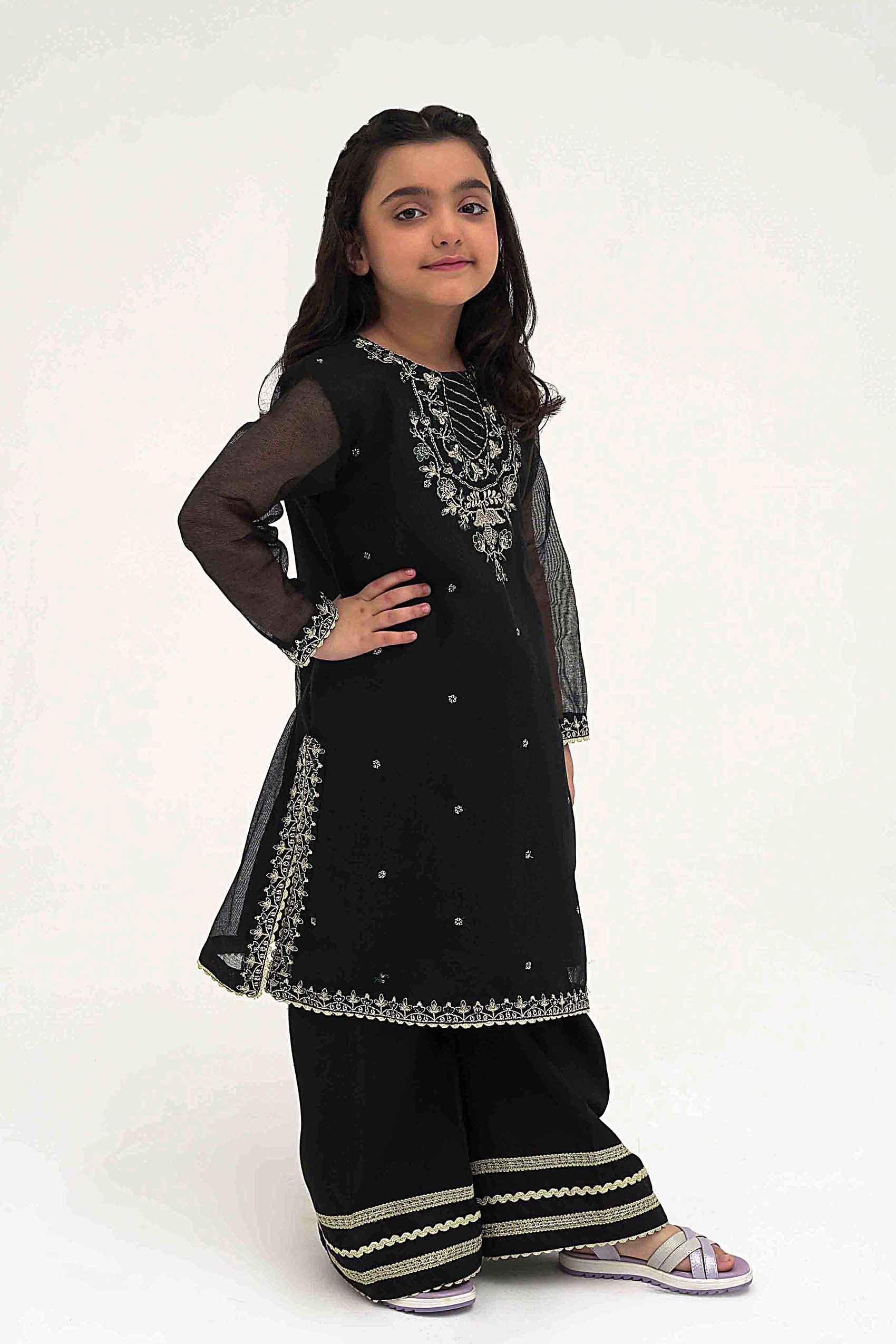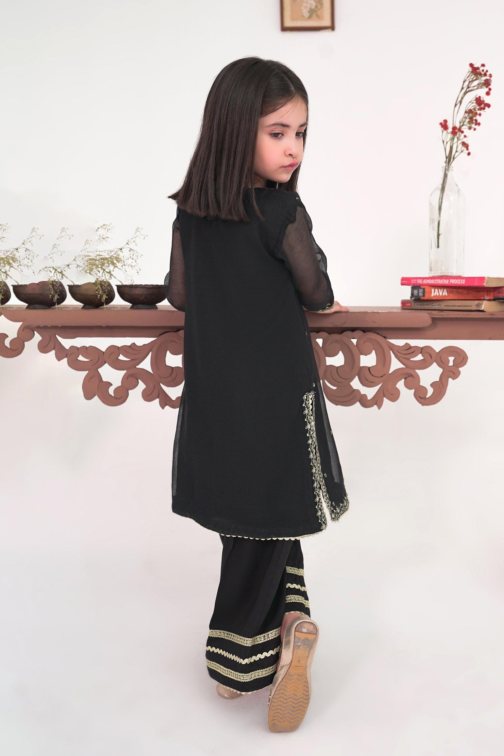 Presenting the epitome of grace and elegance, this exquisite ensemble features a black cotton net shirt enriched with captivating floral embroidered booti spray all over, and detailed embroidery at the slits and hem. The shirt is paired with a classy flowing sharara, adorned with a gotta and lace border at the bottom opening, completing the formal look. Perfect for festive and happening events, this statement ensemble exudes sophistication and charm.
