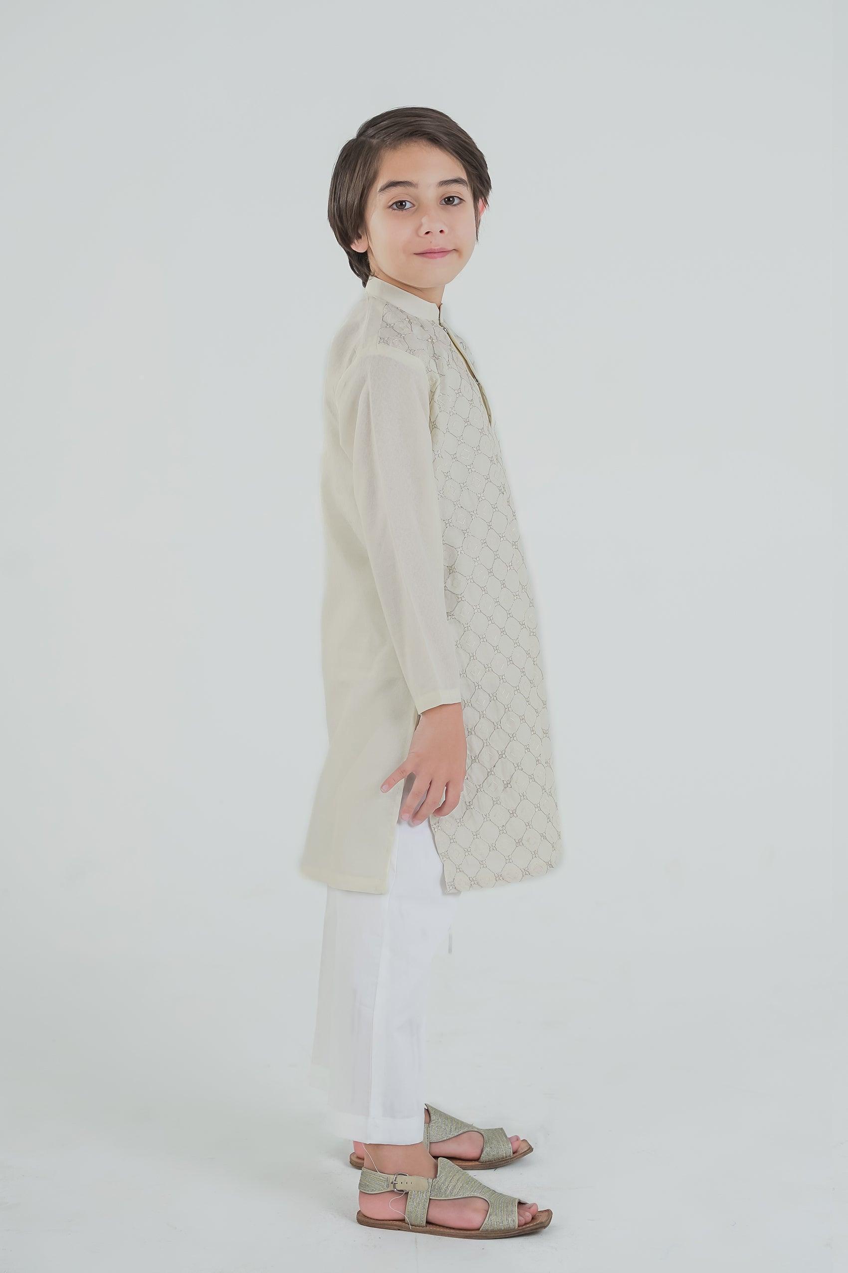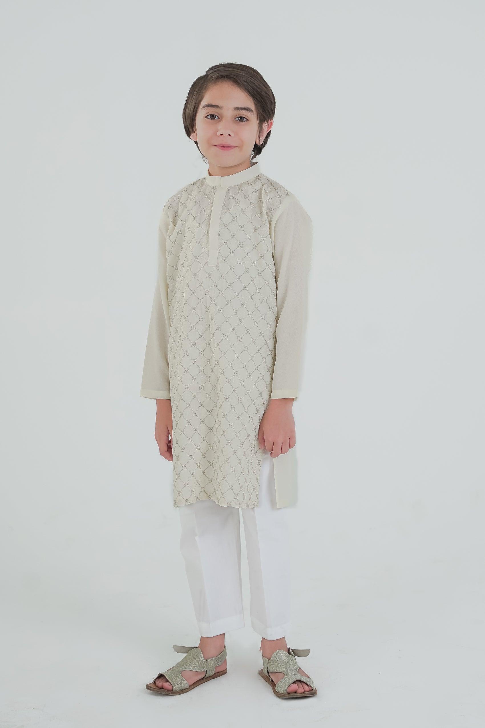 Begin with the foundation of sophistication: this pristine textured white straight kurta paired with matching cambric white trousers. The clean, tailored silhouette of the kurta offers a modern and refined look, perfectly showcasing your little one's sense of style and personality. A versatile and elegant outfit for any occasion.