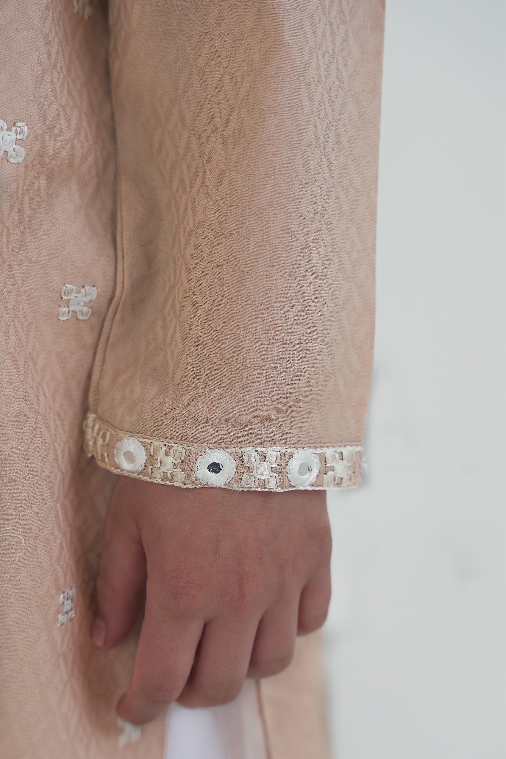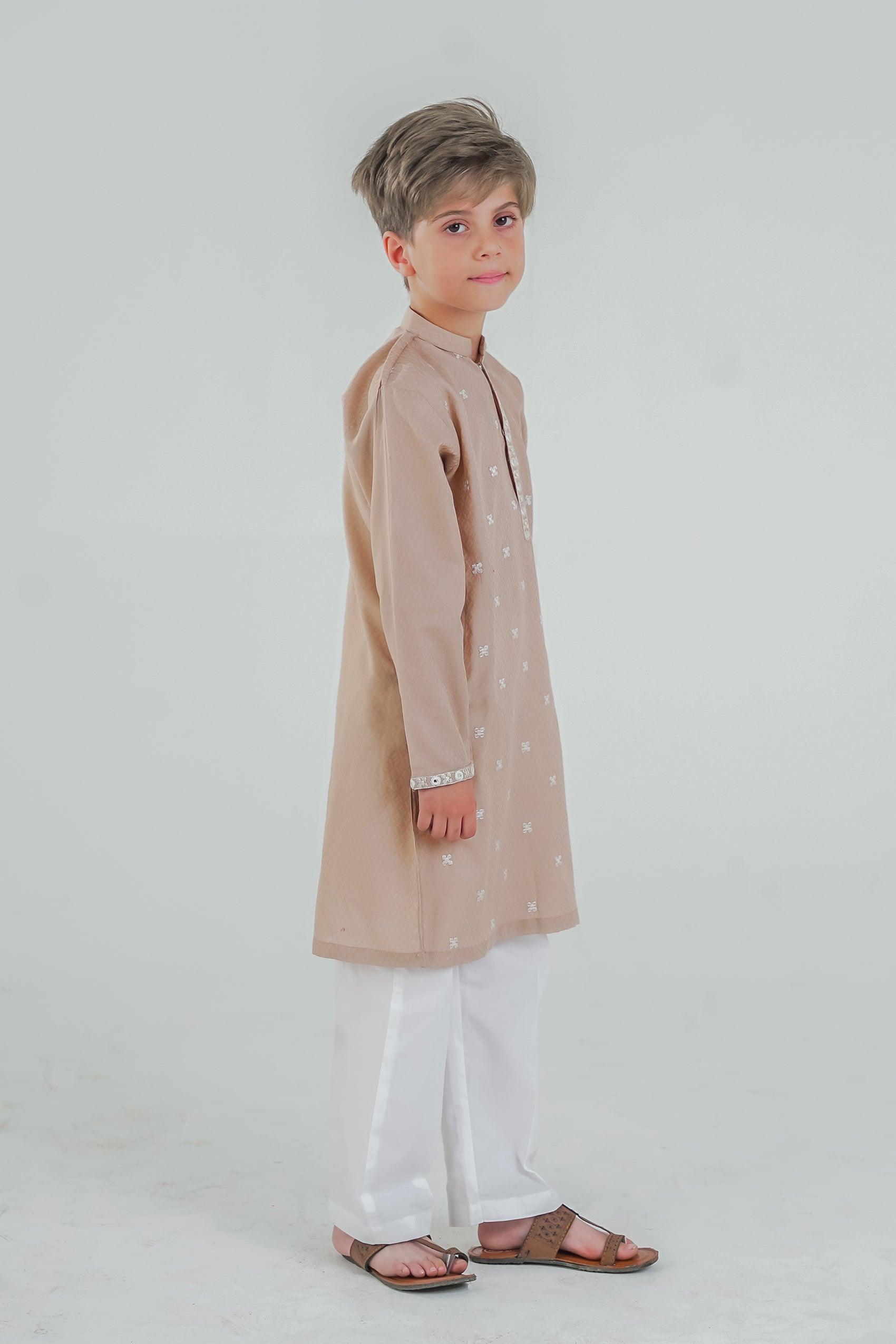 For a festive look that combines sophistication with traditional charm, dress your little one in this beige embroidered kurta paired with a crisp white cambric trouser. The ensemble exudes elegance, crafted with attention to detail, making it a perfect choice for any celebration. The rich color and fine craftsmanship ensure your child looks impeccable.