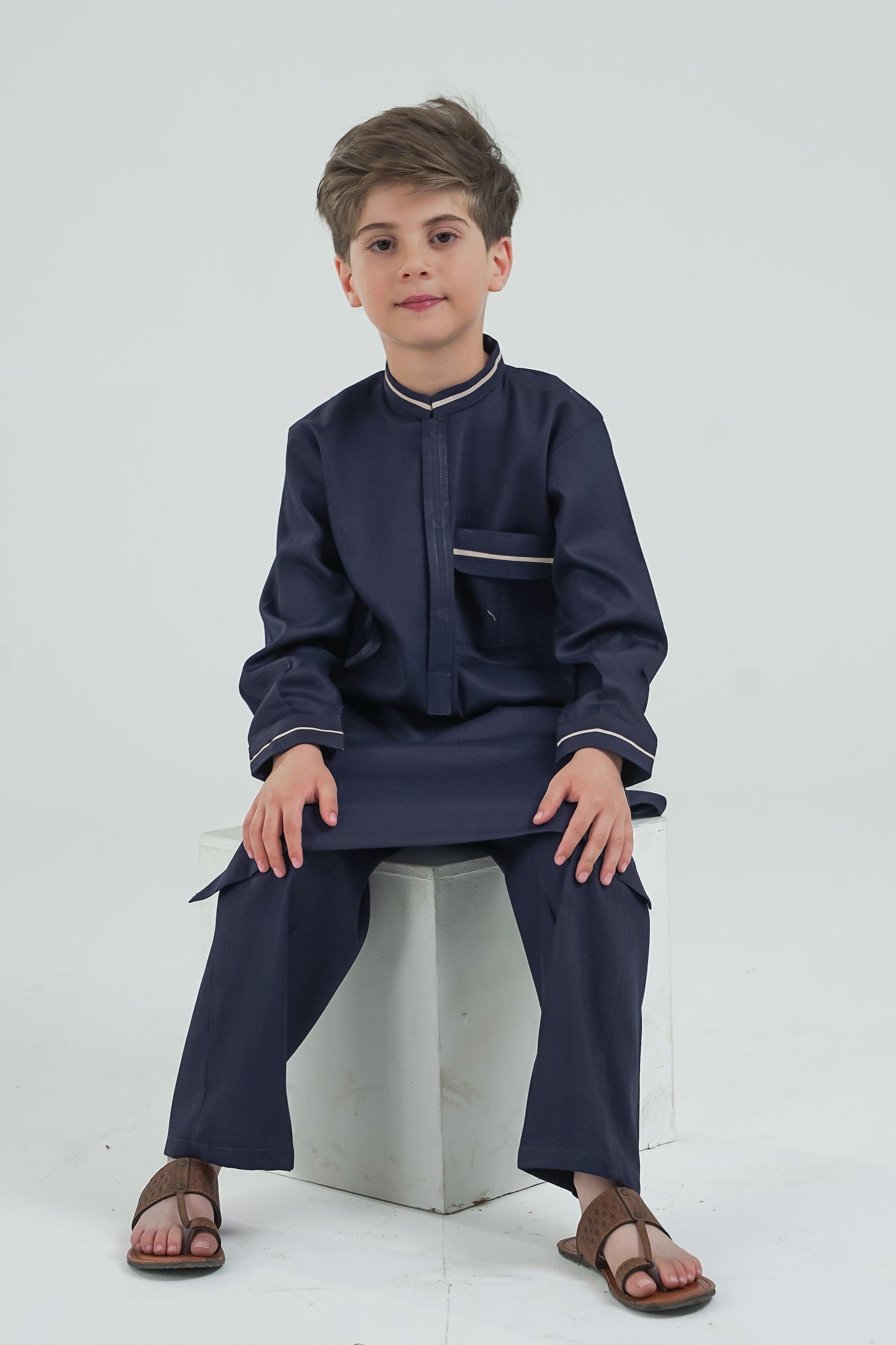 For a perfect blend of tradition and contemporary style, dress your little one in our navy blue textured cambric shirt paired with crisp white trousers. The charming stitching detail on the placket adds a modern touch to this culturally rich ensemble. Ideal for any special occasion, this outfit embodies sophistication with a hint of tradition.